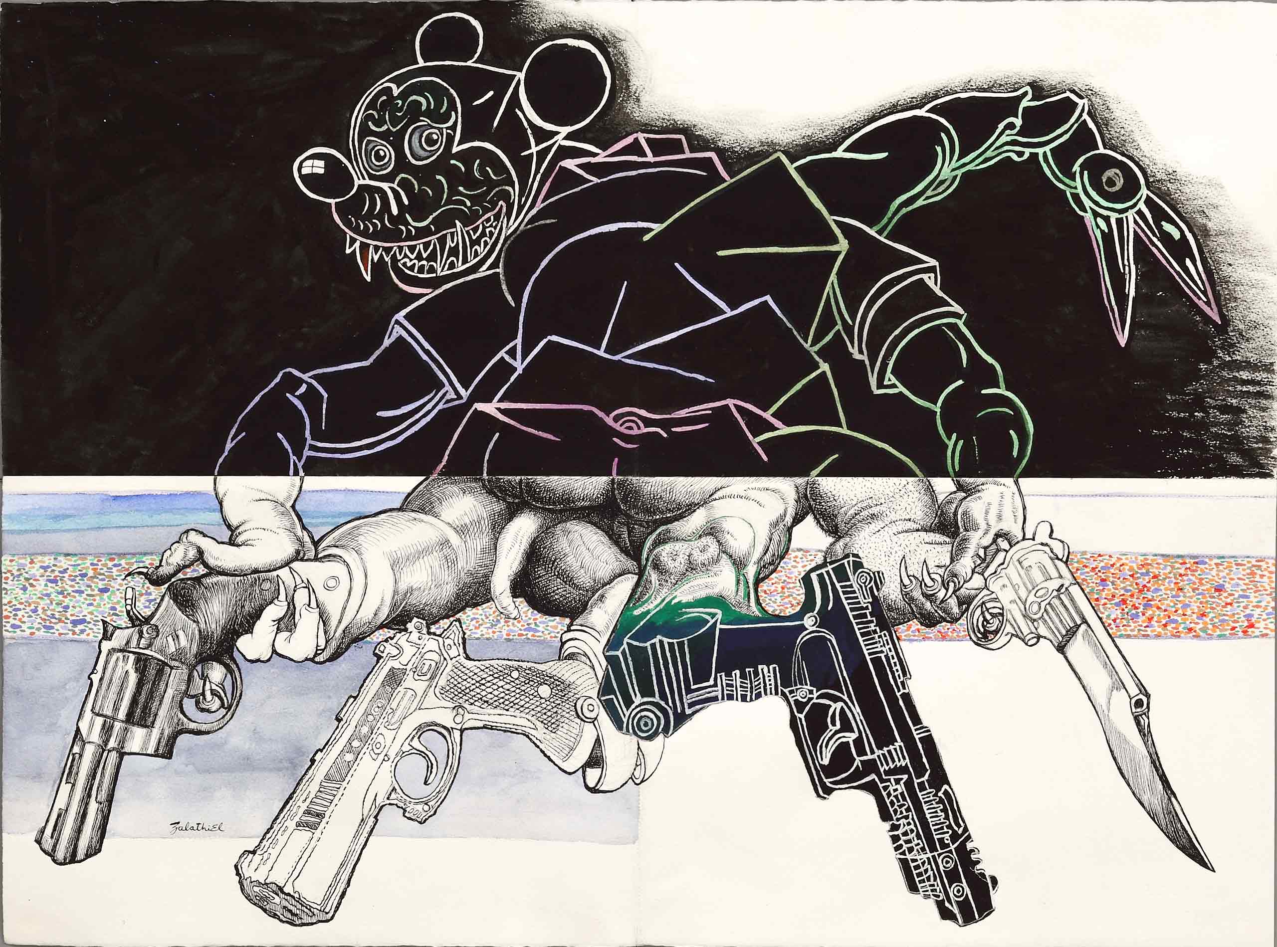 Début / 10-1406-zoologico / Oeuvre 10-1406-zoologico Fiche Technique Productor de Violencia. 2012 Gouache, tinta china, lápiz / papel Arches acuarela56 x 76 cm Antérieure Suivante