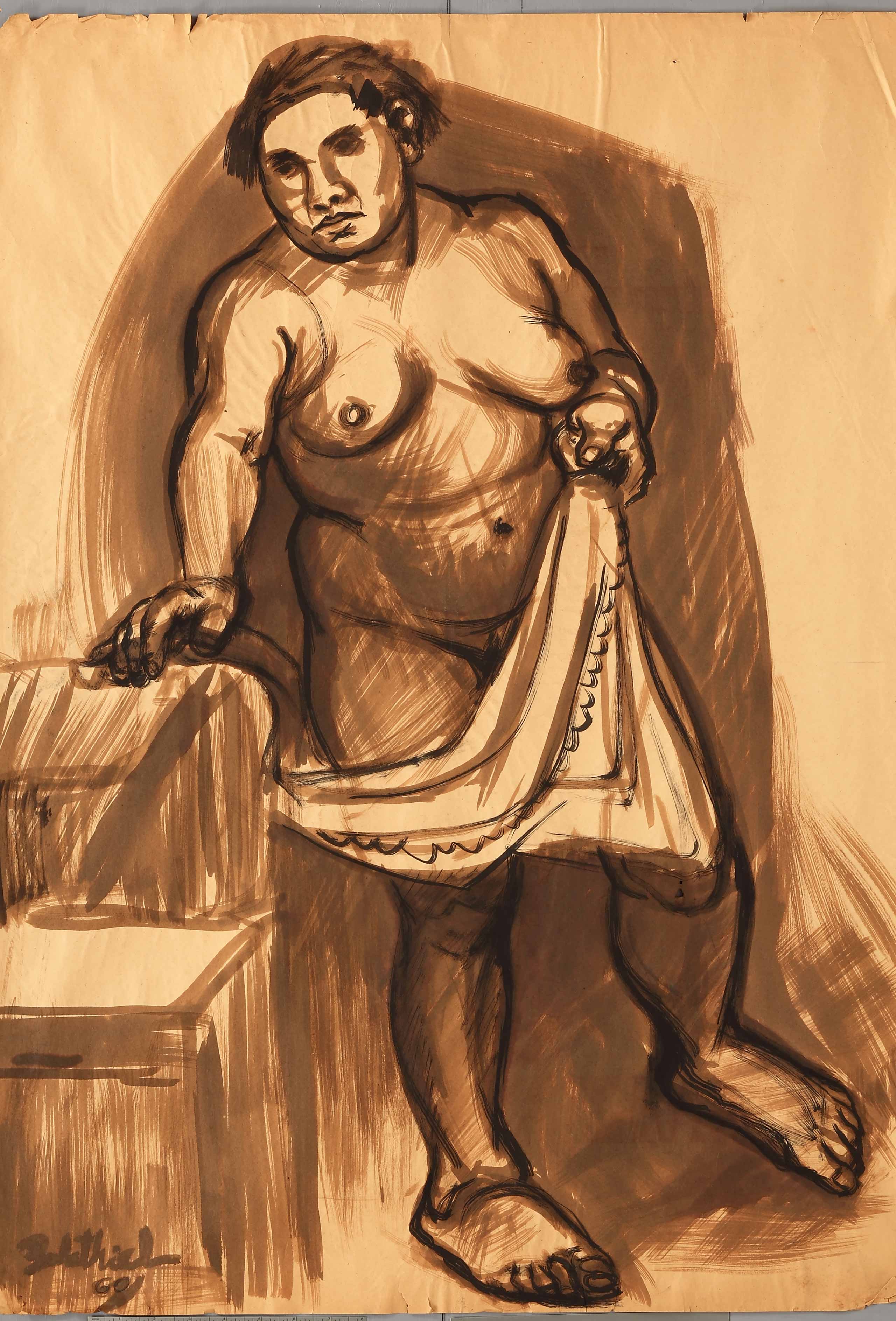 Début / 14-1328-Trabajos-Academicos / Oeuvre 14-1328-Trabajos-Academicos Fiche Technique NU 13, femme Lavis, encres sepia et noire s/papier 95 x 70 cm 1960 Antérieure Suivante