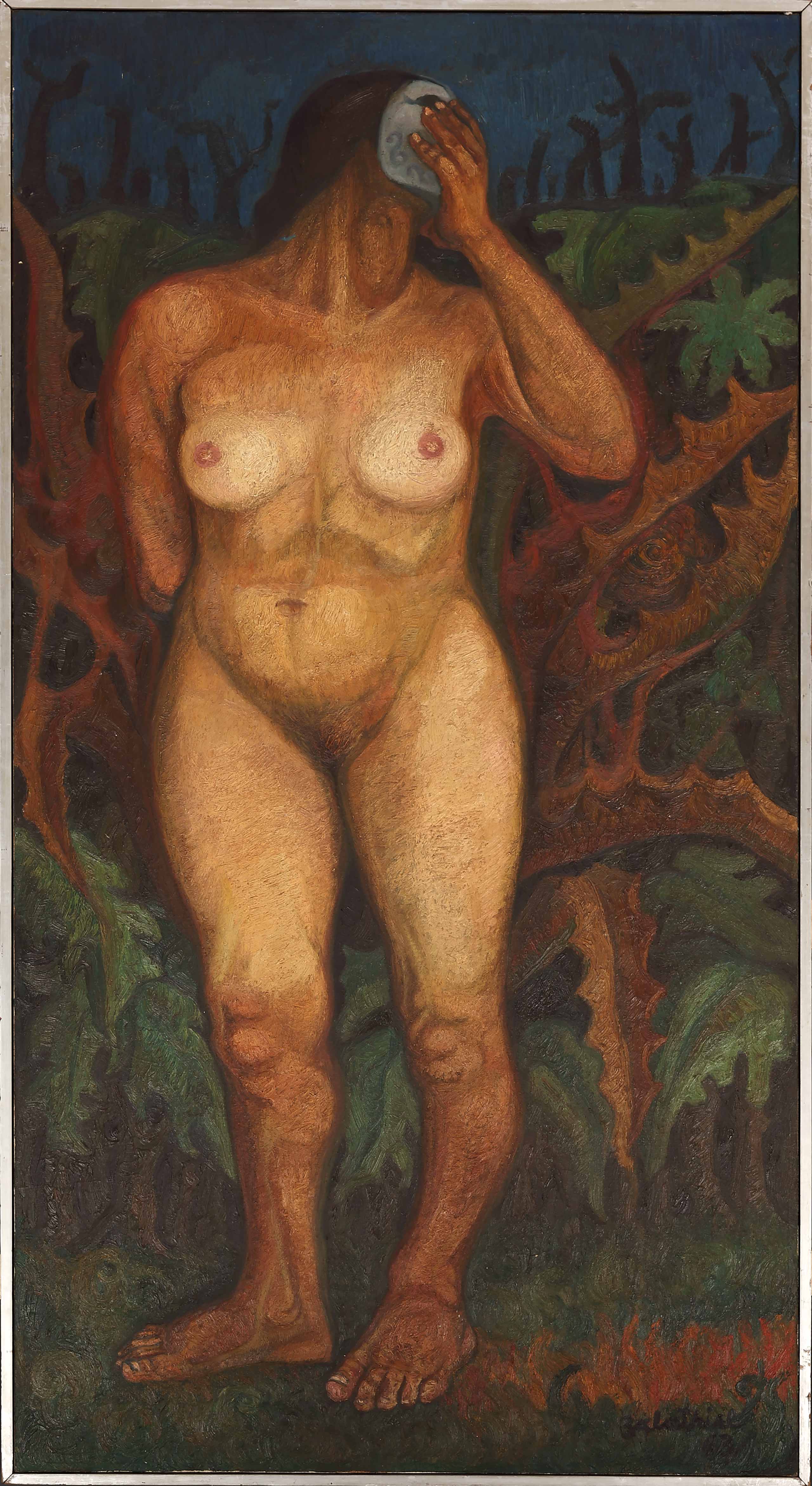UN MASQUÉ Huile s/ toile 124 x 77 cm 1962